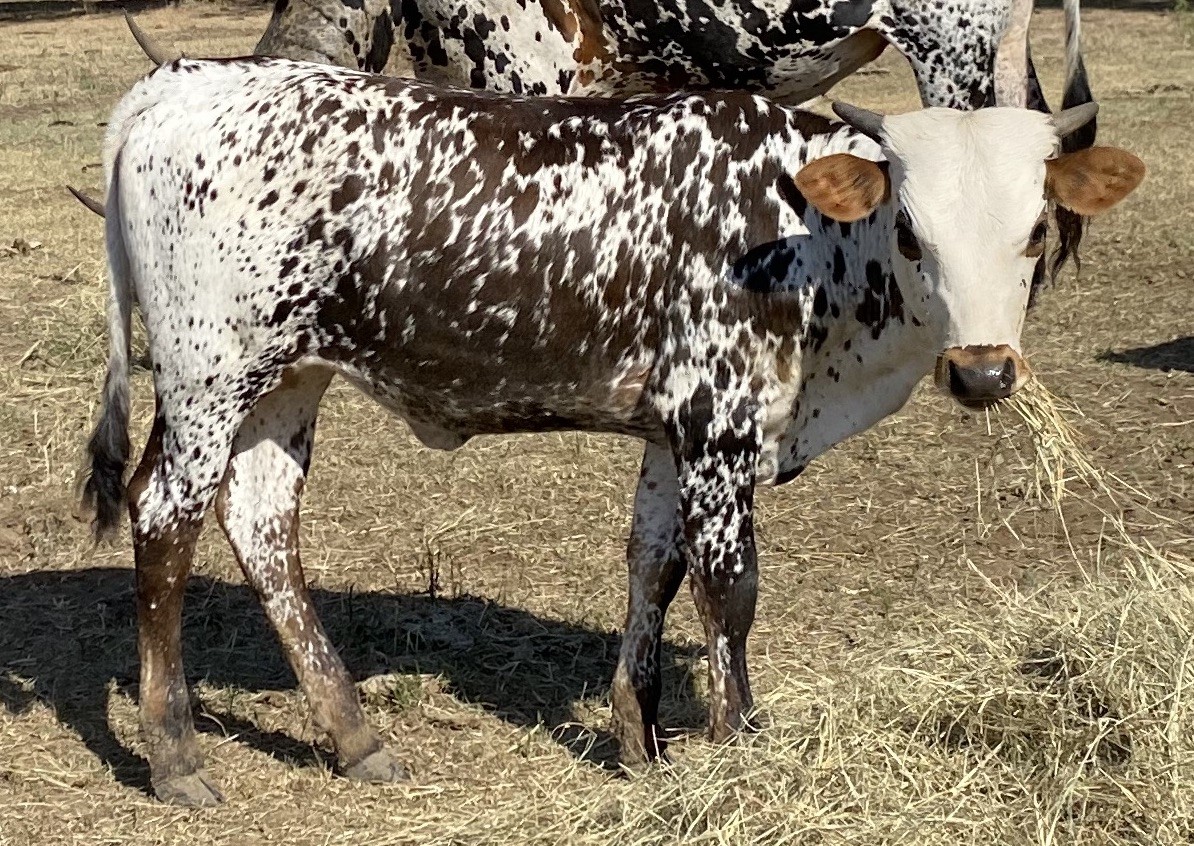 Another flashy heifer, out of our TCC Houdini daughter Ms Dolly Parton. This is young Dolly's second heifer and she is the spitting image of her sire, Jest Command. Beautiful tri-color markings on this baby girl and loads of 80 and 90" horn genetics in her pedigree. SOLD. Thank you Casey Castro for your purchase of this gorgeous heifer.